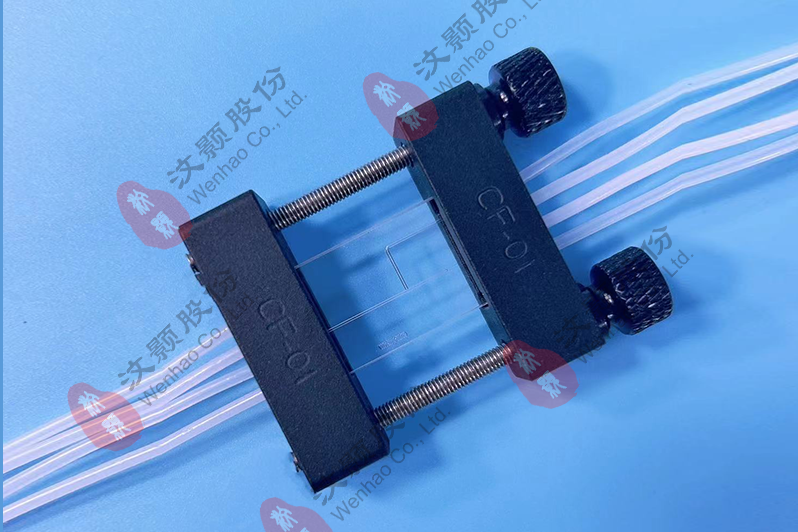 1.將PTFE管插入彈墊中,PTFE管頭距彈墊出口處約1mm,然后將插好管子的彈墊放置在上、下兩片夾具對應(yīng)的位置上。