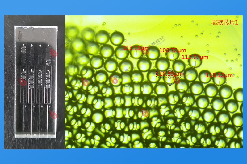 水包油液滴玻璃芯片有標(biāo)準(zhǔn)芯片和定制芯片,通過控制水相和油相在芯片內(nèi)的流速,形成不同粒徑的液滴,而且液滴的尺寸分布比較均一??筛鶕?jù)客戶需求,接受液滴芯片制定,下面是標(biāo)準(zhǔn)液滴芯片產(chǎn)生液滴圖示。